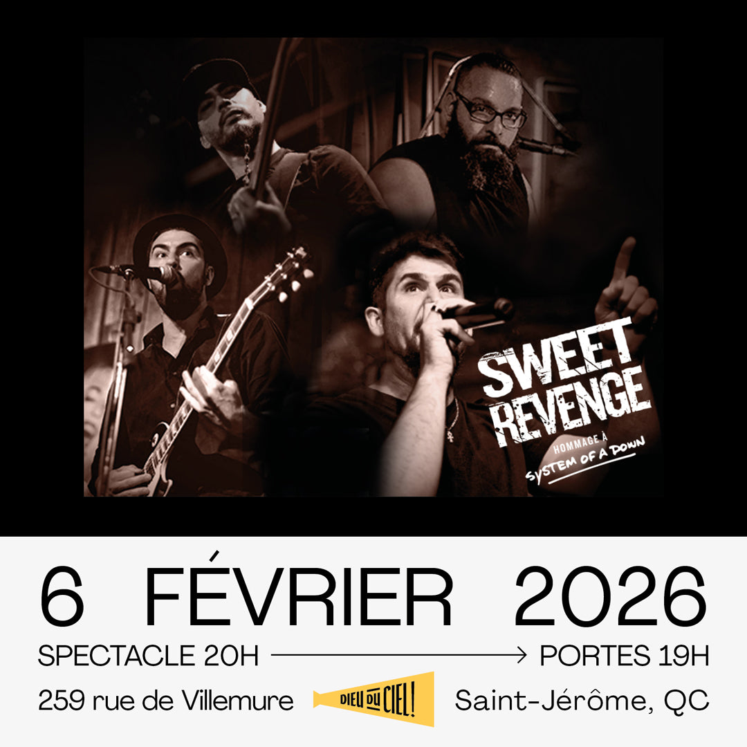 Gagnant de deux concours (Lévis ville du rock et Québec Rock Contest), Sweet Revenge a prouvé sa ressemblance à tous points de vue avec le légendaire groupe californien. Dès les premiers instants, le groupe nous amène au cœur du monde de SOAD avec leur énergie contagieuse. Sweet Revenge, le meilleur hommage à System Of A Down au pays!