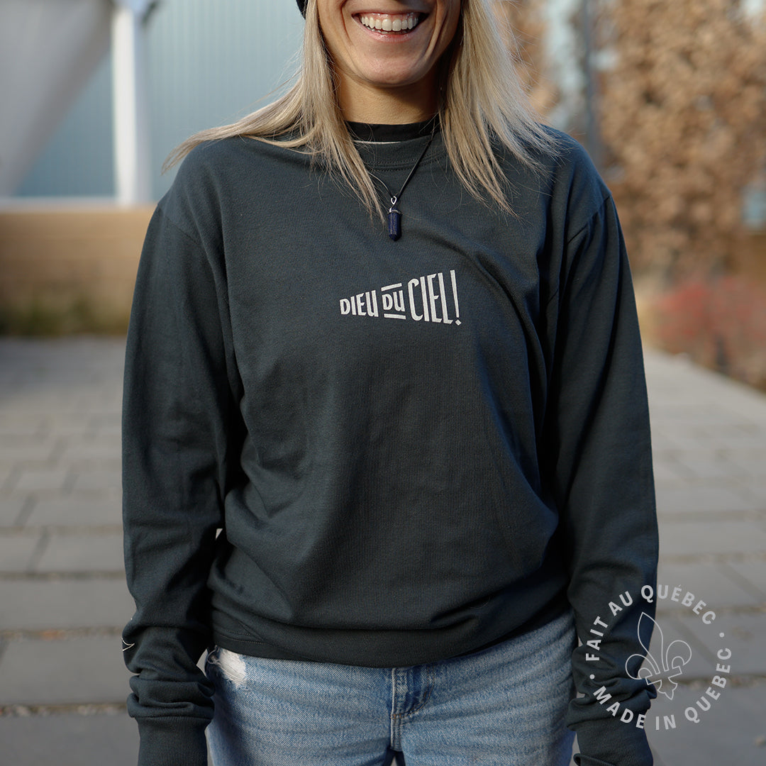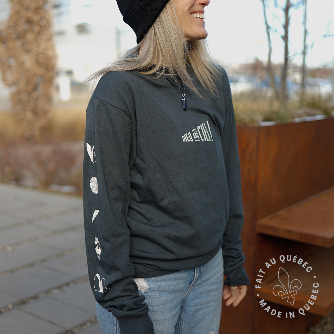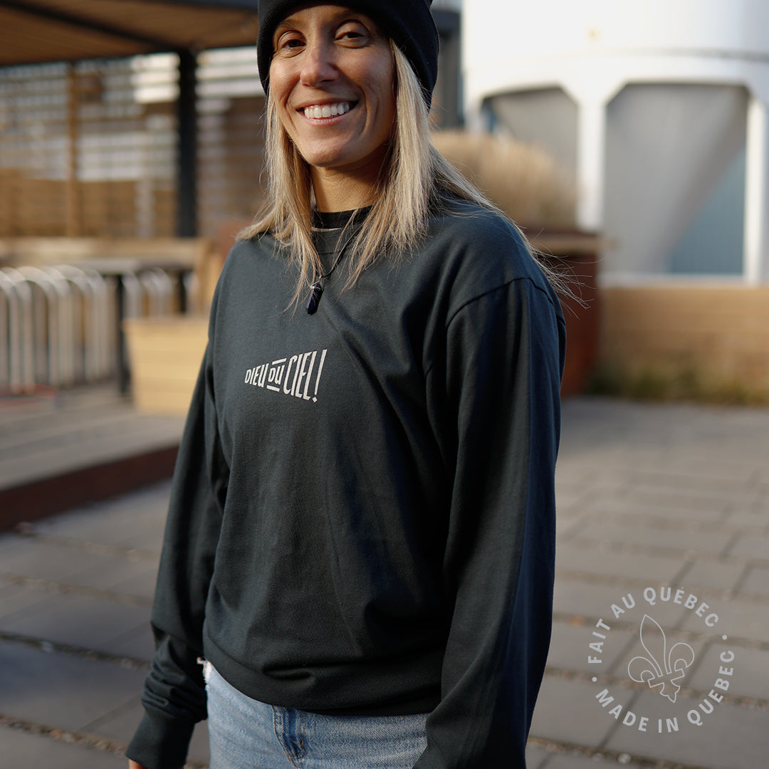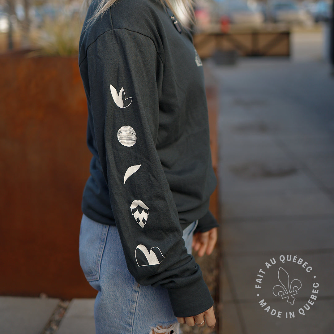Chandail unisexe à col rond et à manches longues dont la coupe confortable et souple conviendra à toutes les morphologies. Coupe classique, sérigraphies blanches. Illustrations de la série houblon par Thaïla Khampo sur la manche, logo Dieu du Ciel! à l'avant.