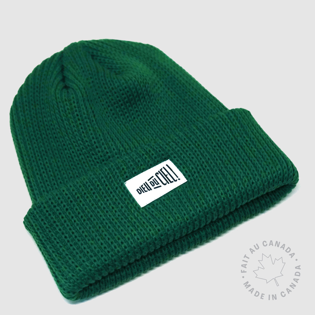 Tuque douce, chaude et confortable en tissu extensible côtelé, de couleur verte. Étiquette du logo Dieu du Ciel! brodé sur le revers.